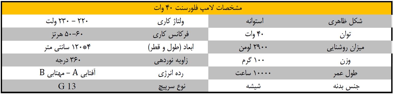 لامپ مهتابی ۴۰ وات فلورسنت پارس با کیفیت بالا.و مطابق با استاندارد ترین تکنولوژی های روز دنیا تولید میشود .